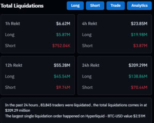 Over the past 24 hours, total liquidations across the crypto market amounted to $209.29 million, with $138.86 million of this coming from long positions. These liquidations, particularly on the long side, indicate that short-term traders are adjusting their positions in response to price fluctuations in Bitcoin and other major cryptocurrencies.