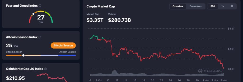 According to CoinMarketCap, the global crypto market started at $4.3 trillion on October 6, dropped to $3.9 trillion around October 10–12, and fell again to $3.35 trillion by November 1. The 24-hour trading volume reached $280.73 billion.