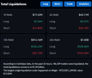 The sudden market downturn also triggered a massive wave of liquidations in derivatives markets. According to Coinglass data, approximately $1.03 billion in positions were liquidated over the past 24 hours, with around $929 million coming from long positions. Highly leveraged trades led to cascading liquidations amid the sharp price movements.