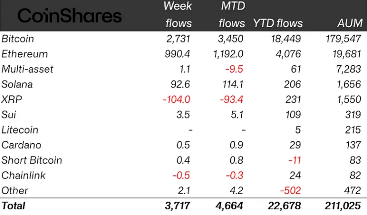 As the crypto market continues its bullish momentum, institutional capital is flooding into digital asset investment vehicles at a historic pace. In the past week alone, crypto investment products attracted a staggering $3.7 billion in net inflows, pushing the total assets under management (AUM) to a record-breaking $211 billion — the highest level ever recorded.