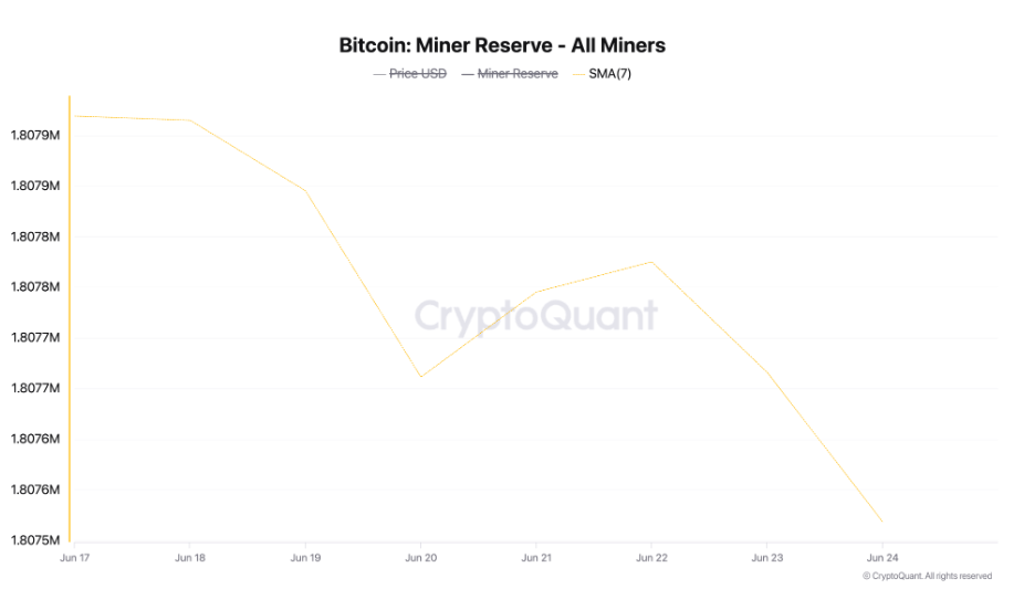 According to CryptoQuant data, the Bitcoin miner reserve has decreased by 0.022% on a seven-day moving average. This decline indicates that miners are preparing their coins for sale.