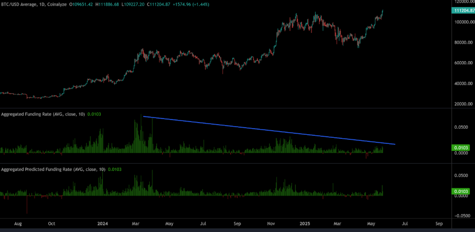 Funding rates indicate that Bitcoin’s current rally is healthy and organic. These rates were six times higher in Q1 and three times higher in Q4 of last year. The current low rates suggest minimal speculative activity in the futures market.