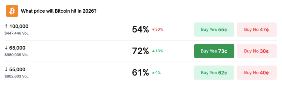 Bitcoin probability of dropping below $65,000 in 2026 reached 72% on Polymarket. Analysts point to tight US liquidity conditions and ongoing bearish trends as factors increasing selling pressure. A weekend drop briefly pushed prices below $75,000.