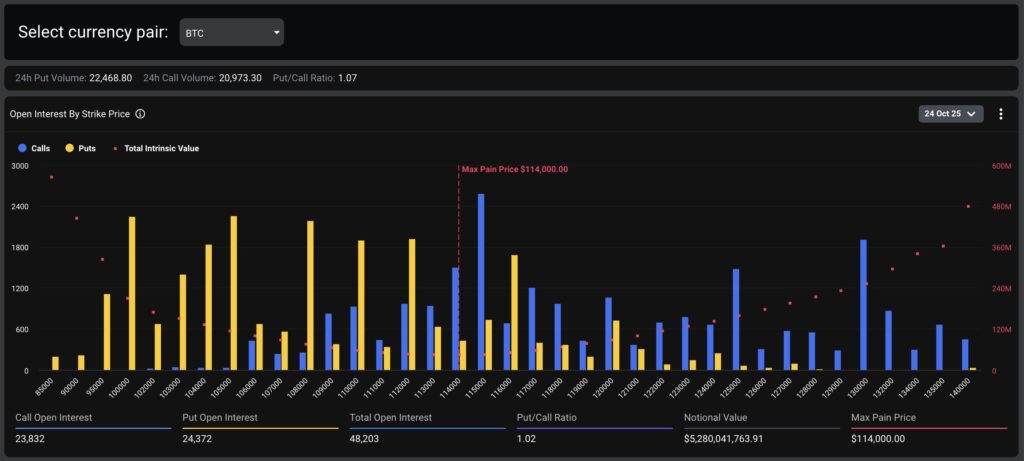 Nearly 47,000 Bitcoin options contracts, worth around $5.1 billion, are set to expire on Friday, October 24. While this expiry is slightly larger than last week’s, analysts expect limited impact on spot Bitcoin prices, which have traded mostly sideways in recent sessions. However, the U.S. government shutdown and the delayed September CPI report could add volatility if inflation exceeds the expected 3.1%, potentially triggering short-term price swings across crypto markets.