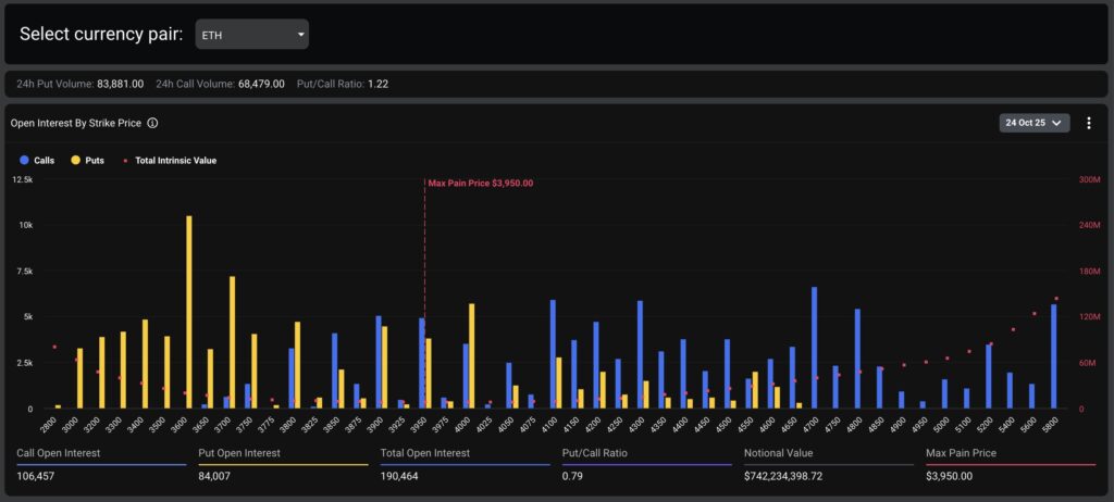 Alongside Bitcoin, around 193,000 Ethereum options contracts, valued at roughly $749 million, are also expiring today. The max pain level for ETH options sits near $3,950, with a put/call ratio of 0.78, suggesting a slightly bullish bias. Total Ethereum open interest now exceeds $15 billion, bringing the combined crypto options expiry value to nearly $5.8 billion.
