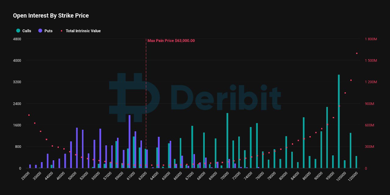 The Bitcoin price may drop to $63,000 on July 26 due to the expiry of over $3.9 billion worth of Bitcoin futures options. These options expired at 8:00 am UTC on Deribit, a top futures trading cryptocurrency exchange. This sets Bitcoin’s “max pain point” to $63,000, potentially leading to more downward pressure.