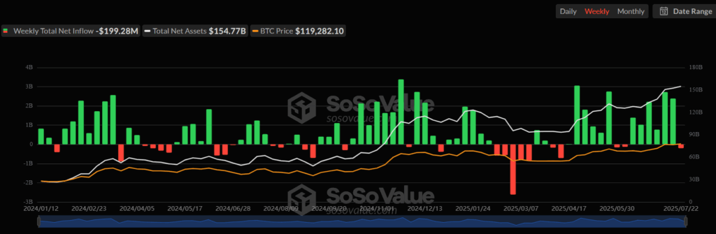After reaching its record high of $122,054 on July 14, Bitcoin experienced a pullback. Institutional investors withdrew a total of $199 million from US-listed spot Bitcoin ETFs this week. The six-week streak of net inflows has now turned into outflows.