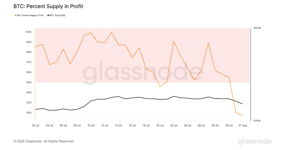 This price action has also impacted the share of BTC supply held in profit. According to Glassnode, as of August 1, Bitcoin’s supply in profit dropped to 91.71%, the lowest level in 41 days. This metric indicates what percentage of circulating BTC is currently held above acquisition cost.
