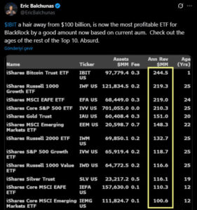 Managing over $10 trillion in assets, BlackRock’s Bitcoin spot ETF IBIT has made a mark alongside its traditional funds. According to Bloomberg ETF analyst Eric Balchunas, as of early 2025, IBIT has surpassed long-standing funds including: