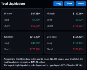 The sharp price movements in the crypto market have triggered significant liquidations in derivatives markets. Rapid price fluctuations led to the closure of many high-leverage positions. In the last 24 hours, total liquidations reached $451 million: