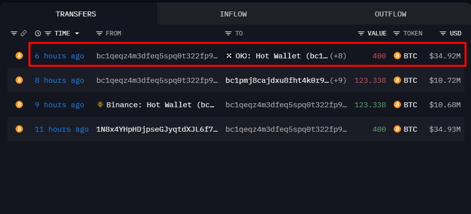 The holdings entered the wallet through two separate inflows of 200 BTC each, previously transferred from HTX. After years of inactivity, the entire balance was moved in a single transaction to an address associated with OKX. The transfer reportedly took place around 11 hours before it was publicly identified, raising speculation about a potential sell-side move.
