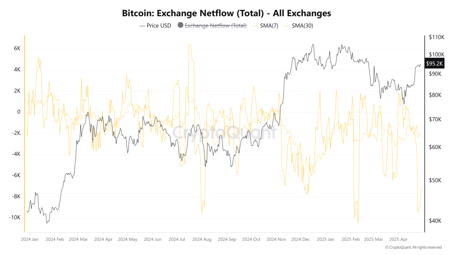 Data from CryptoQuant indicates that BTC inflows into exchanges have continued to decline, suggesting that investors are moving their assets into cold storage for long-term holding. Negative net flows throughout April confirm that the market has entered a strong accumulation phase.