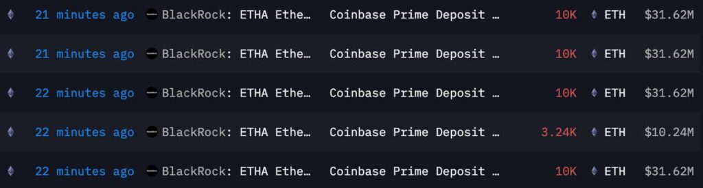 Blockchain data shows that multiple transfers occurred from BlackRock’s wallet to Coinbase Prime within short intervals.