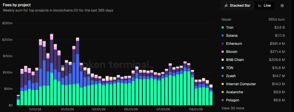 In September, blockchain network revenues fell by 16% as cryptocurrency market volatility decreased. According to VanEck, Ethereum, Solana, and Tron all experienced revenue drops, while Tron maintained its leadership position.