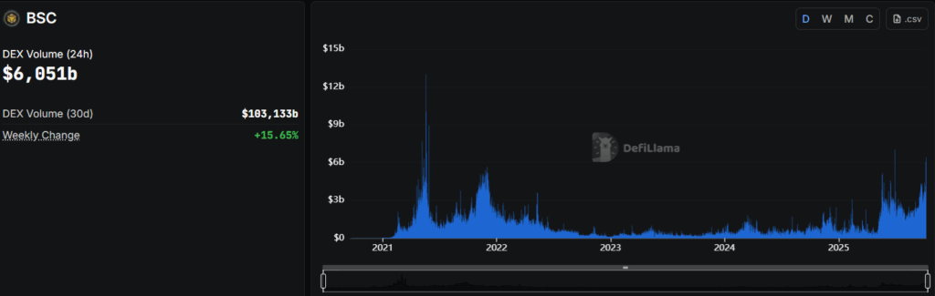 DEX trading activity on BNB Chain showed a significant increase this week. On October 7, the chain’s decentralized exchange (DEX) volume reached $6.051 billion, marking the second-highest level this year. The surge in on-chain memecoin activity contributed strongly to this growth.