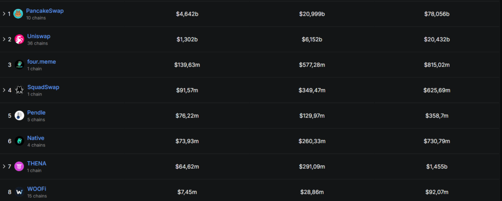 For crypto investors, this volume is an important indicator of market trends. PancakeSwap captured the largest share of this growth, highlighting its dominant position in the ecosystem.