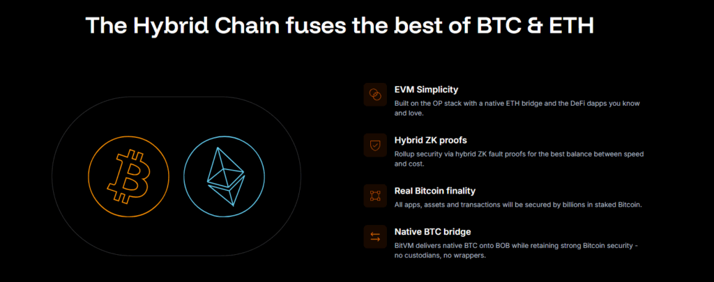 BOB (Build on Bitcoin) is a Hybrid Layer 2 (Hybrid L2) blockchain solution that inherits security from Bitcoin. Its goal is to combine Bitcoin’s security with Ethereum’s flexibility to create a premier liquidity and application hub for both users and institutions. BOB offers a unique hybrid chain model that merges Bitcoin staking with ZK proofs and establishes native bridges between Bitcoin and Ethereum.
