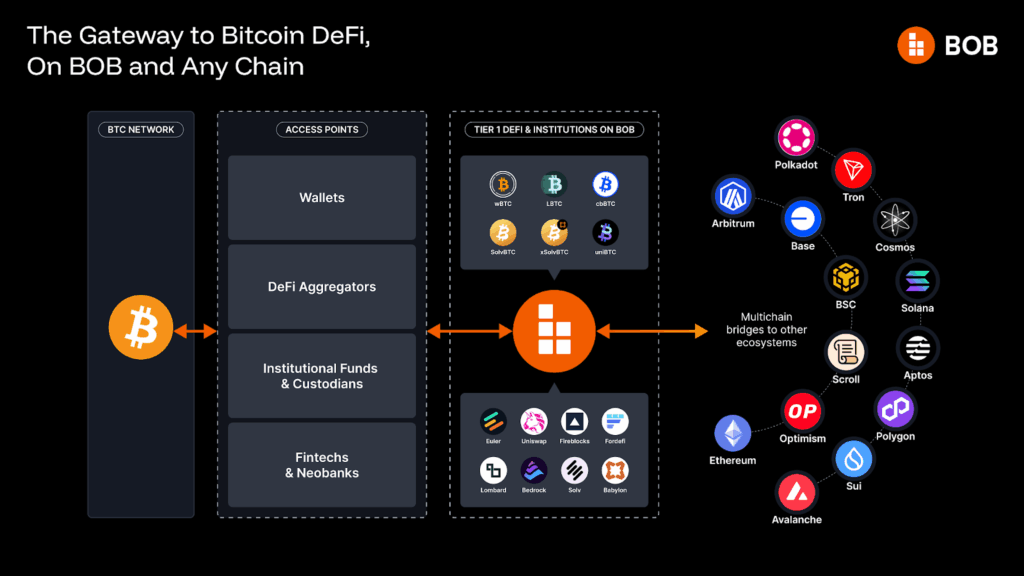 BOB integrates tier 1 DeFi protocols including Uniswap, Euler, Aave, LiFi, Lombard, Chainlink, Babylon, and Solv. Corporate partners include Fireblocks, Cobo, and ForDeFi, supporting rapid ecosystem growth.