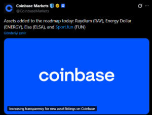 Coinbase announced that it has updated its listing roadmap and added four new crypto assets to its evaluation process. According to the statement, Raydium, ENERGY, ELSA, and Sport.fun have been included in the platform’s official listing roadmap. The development quickly drew attention in the crypto market and led to increased activity in the related tokens.