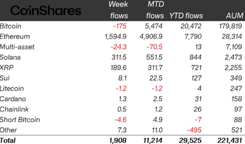 Following Ethereum, Solana and XRP were the week’s other top gainers, attracting $311.5 million and $189.6 million, respectively. However, some alternative digital assets like Litecoin and Bitcoin Cash saw modest outflows.