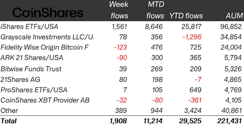 Despite a 57% drop compared to the previous week’s record $4.4 billion inflow, overall market appetite remained strong. iShares crypto ETPs by BlackRock led the week with $1.56 billion in inflows.