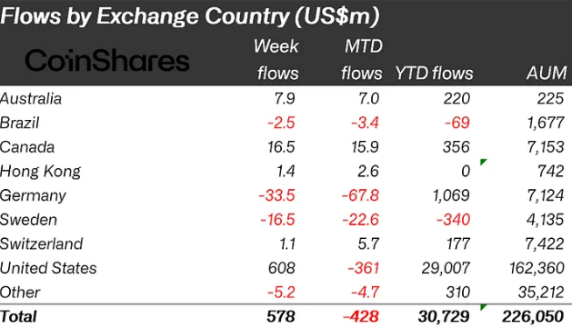 Trump’s decision caused outflows seen midweek to quickly reverse into inflows. According to the CoinShares report, investors initially made $1 billion in crypto outflows earlier in the week. However, the government’s green light for cryptocurrencies balanced these outflows with $1.57 billion inflows. As a result, the net inflow reached $578 million.