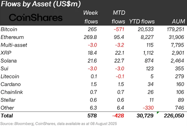 Last week, crypto inflows surged to $578 million, triggering an upward trend. The main driver behind this increase was Trump’s decision to allow crypto assets in the US 401(k) retirement plans. Following a $223 million inflow the previous week, this development created significant momentum in the markets.