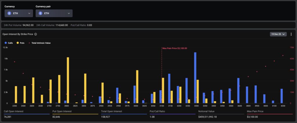 “ETH positioning is more distributed across strikes, with notable upside interest above 3.4K, keeping larger moves in play if volatility reaccelerates.”