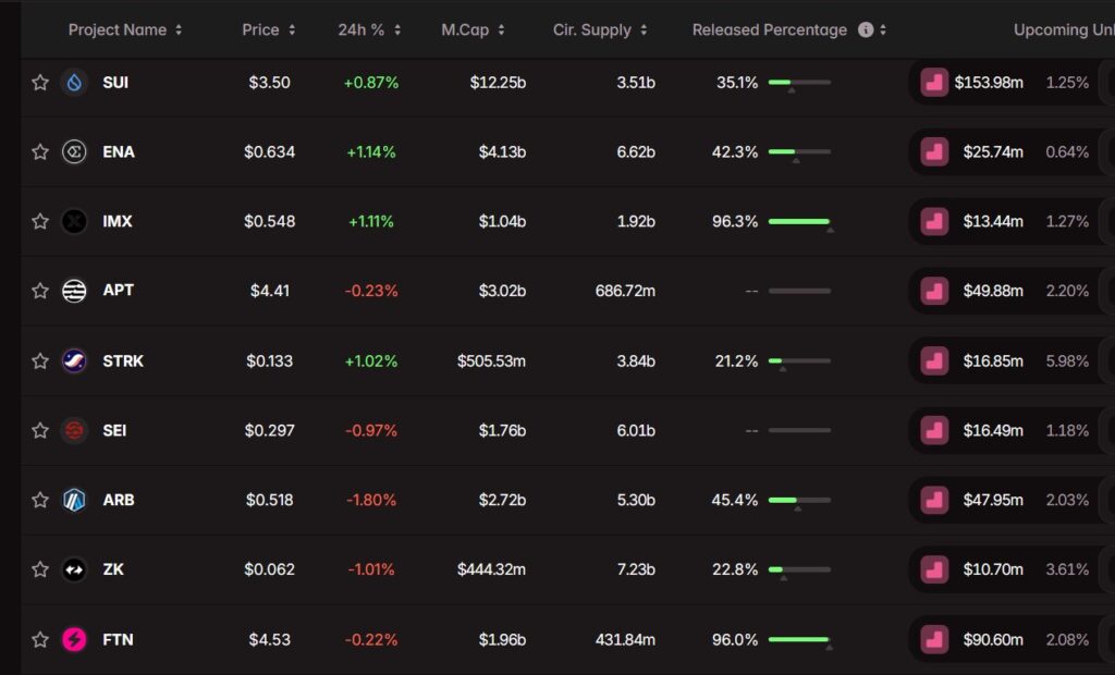 FTN follows with $90 million in token unlocks. Unlike Sui, FTN has already released over 96% of its supply, so the impact will be smaller. Aptos plans to unlock nearly $50 million, while Arbitrum will release approximately $48 million next month.