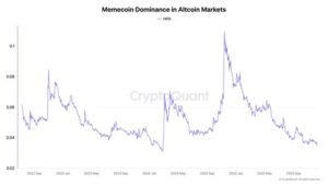 Drawing on market data tracked throughout the year, Ki Young Ju noted that in early 2025, memecoins’ share of the total altcoin market surpassed a historical peak of 0.1%. However, recent figures show a steady decline, with that share now falling below 0.04%.