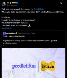 Reward campaigns can drive short-term traffic, but retaining users once incentives decrease becomes critical. How Predict.fun will approach this challenge remains unclear. In his announcement, CZ stated: