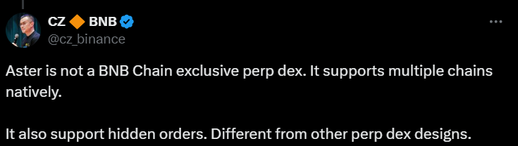 Previously linked to the Binance ecosystem, Aster received investment from YZi Labs (formerly Binance Labs) last year. CZ’s endorsements and the platform’s multi-chain capabilities drew attention to Aster.