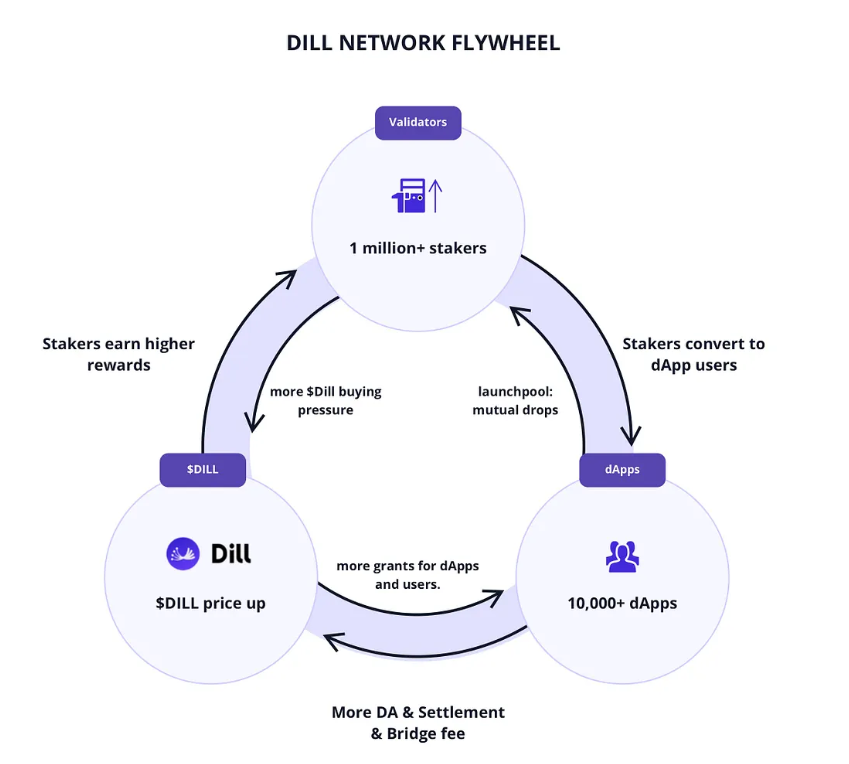 Dill’s ecosystem includes validators, dApps, game developers, and AI agents. Launchpool and mini-pool staking enhance user and developer engagement, boosting DL demand and network security.