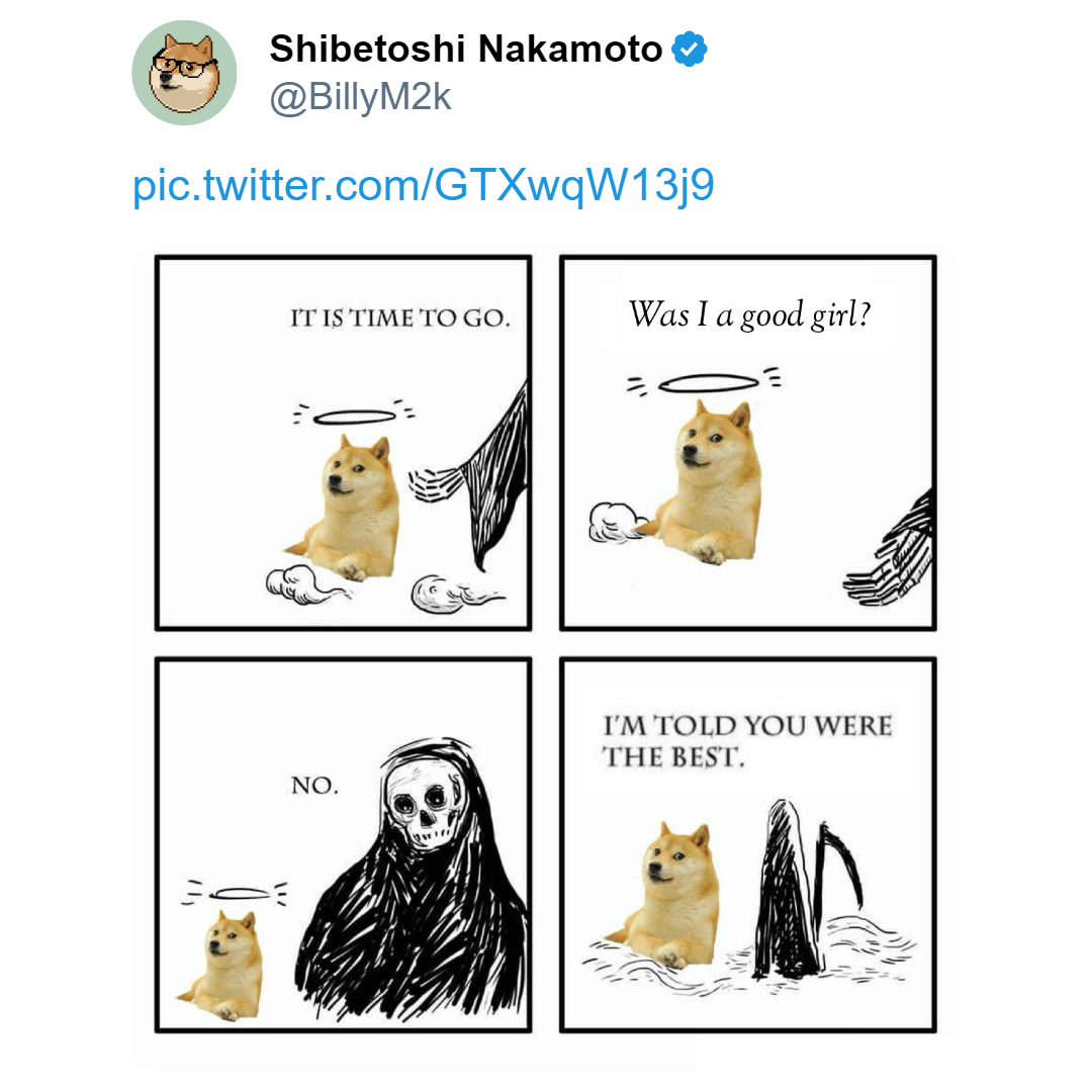 In a post on Kabosu chatting to Death, Markus—known on X as Shibetoshi Nakamoto—published notes whereby the dog says, “It’s time to go.” When she asks Death whether she “was a good girl,” Death responds, “No. I had been informed you were the best.