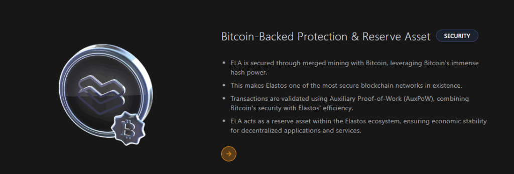 - Merged Mining: Uses Bitcoin’s hashpower to secure ELA.
