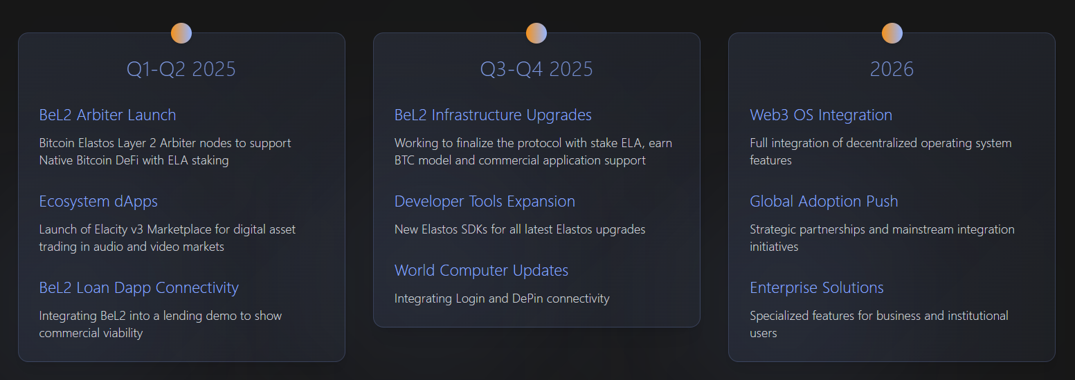 - H2 2025: Finalize BeL2 protocol with ELA staking, BTC model support, expand developer tools, update World Computer.