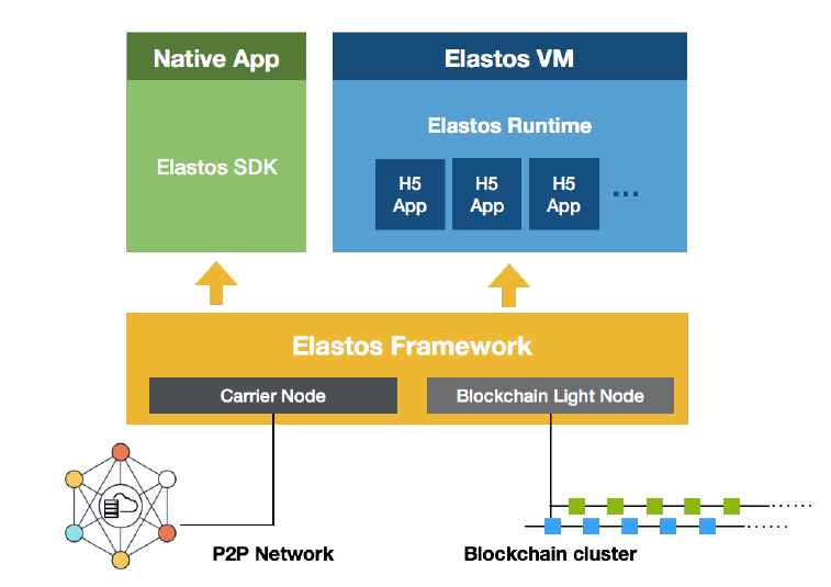 - Elastos Carrier: Fully decentralized P2P network that transmits app traffic.