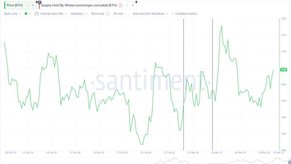 Whale behavior has also shifted. Large investors reduced their holdings from 113.70M ETH on March 7 to approximately 113.61M ETH on March 10, a decrease of around 90,000 ETH. This combination shows that the current recovery lacks the accumulation support that fueled the previous 15% ETH price rise.