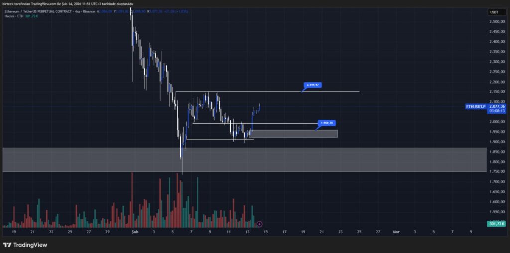Ethereum has reclaimed the $2,000 level and is currently trading around $2,087. At first glance, this appears positive. However, the price is struggling to build sustained momentum, and the market is showing hesitation.