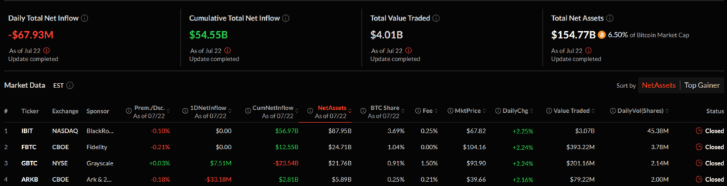 Meanwhile, a different trend was observed in Bitcoin ETFs. As of July 22, there was a net outflow of $67.93 million from Bitcoin ETFs. This trend suggests a shift toward portfolio diversification. Bitcoin ETFs currently have a cumulative net inflow of $54.55 billion and total daily trading volume of $4.01 billion.