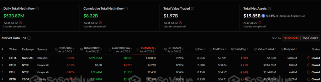 Spot Ethereum ETFs attracted substantial interest from investors. According to recent data, Ethereum ETFs experienced a net inflow of $533.8 million. This significant figure reinforces investor confidence in Ethereum-based products and has had a notable impact on ETH’s market capitalization.