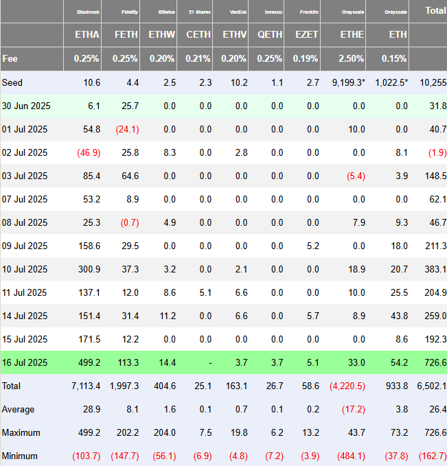 Spot Ethereum ETFs in the US recorded $726.6 million in net inflows on July 16, 2025. This marked the largest single-day inflow ever for spot Ether ETFs. The day’s leader was BlackRock, which funneled $499 million into its ETHA fund.