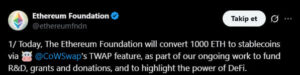 According to the foundation, the ETH-to-stablecoin conversion will be executed using CoWSwap’s TWAP (Time-Weighted Average Price) feature. This method helps minimize price fluctuations, ensuring a more stable conversion process.