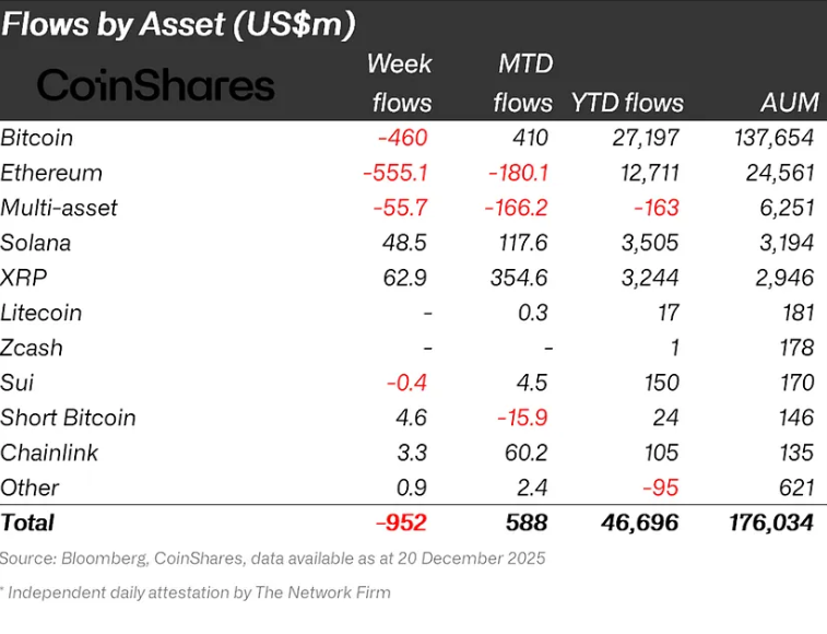 Bitcoin also faced sustained pressure, with weekly outflows of $460 million. While year-to-date inflows remain strong, Bitcoin continues to trail its 2024 performance as prices struggle to regain momentum. Multi-asset products and smaller allocations, including Sui, also posted modest losses during the week.