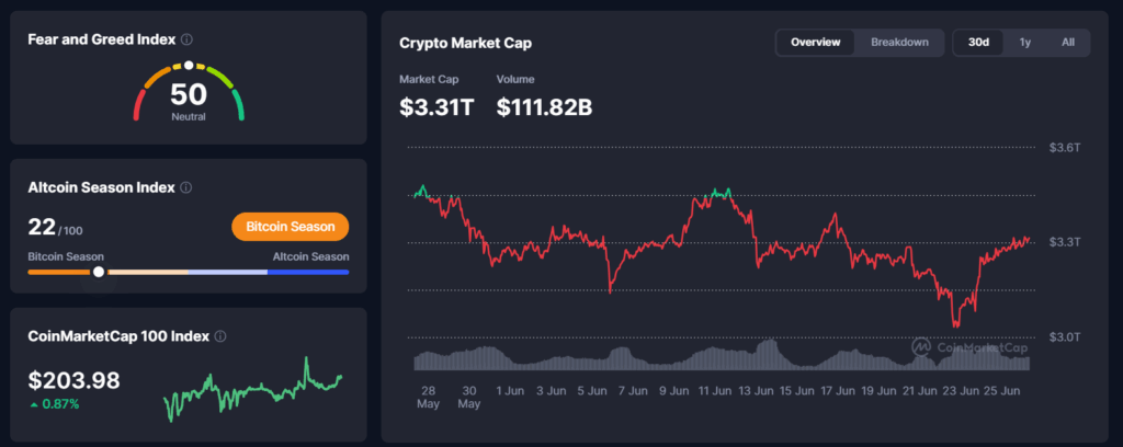 According to CoinMarketCap, the Bitcoin Fear and Greed Index stands at 50, indicating a neutral sentiment. Investors are neither overly fearful nor greedy, showing cautious optimism and market stability.