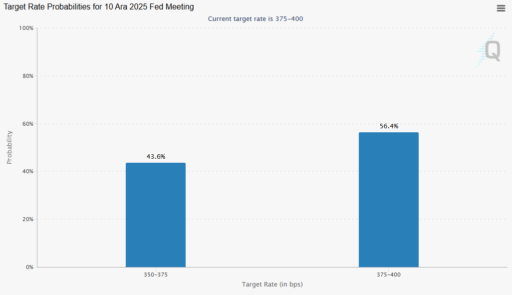 In interest-rate markets, traders now assign a 43.6% probability to a 25-basis-point rate cut at the Fed’s next meeting, while the likelihood of rates being left unchanged has risen to 56.4%. These figures mark a shift from last week, when expectations for an additional cut were stronger. Although the Fed has already lowered rates twice this year, several policymakers have recently expressed caution, pointing to persistent inflation pressures and continued resilience in the labor market.