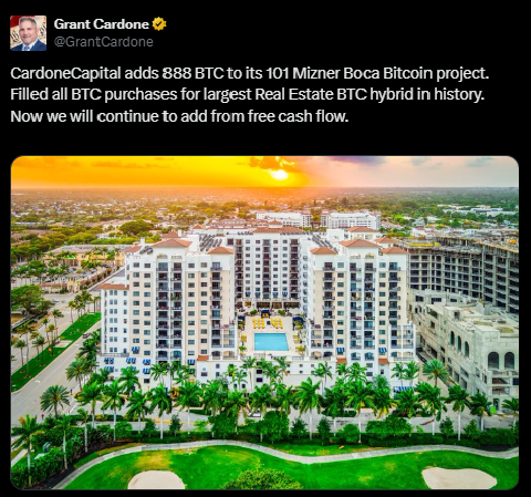 Cardone Capital, one of the most prominent names in real estate investment, has taken another notable step into the crypto market. The firm recently acquired 888 Bitcoin, amounting to roughly 84 million dollars, reinforcing its position in what is considered one of the largest real estate–Bitcoin hybrid initiatives to date. This purchase expands the BTC holdings linked to the company’s 101 Mizner Boca project, marking a significant milestone in the firm’s long-term digital asset strategy.