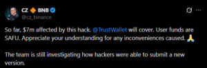 Changpeng Zhao (CZ), founder of Binance and owner of Trust Wallet, issued a statement to reassure users. Zhao said that the total losses identified so far are approximately $7 million, adding that Trust Wallet will compensate affected users.