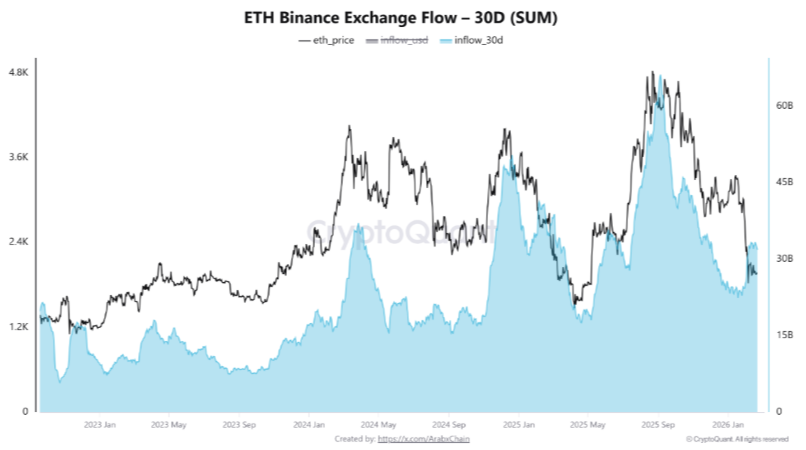 Buterin’s sales coincided with a sharp rise in Ethereum inflows to Binance. According to analysts, total inflows over the past 30 days reached around $33.3 billion, marking the highest level since November 2025.