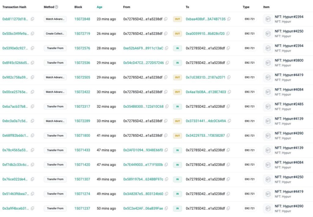 Attacker’s Movement: Transaction records show extraordinary activity on the suspected attacker wallet 0x72785D42…e1a5238df. Multiple Hypurr NFTs (#2394, #4419, #4084, #4250) were transferred in from different wallets between 50 and 23 minutes ago.